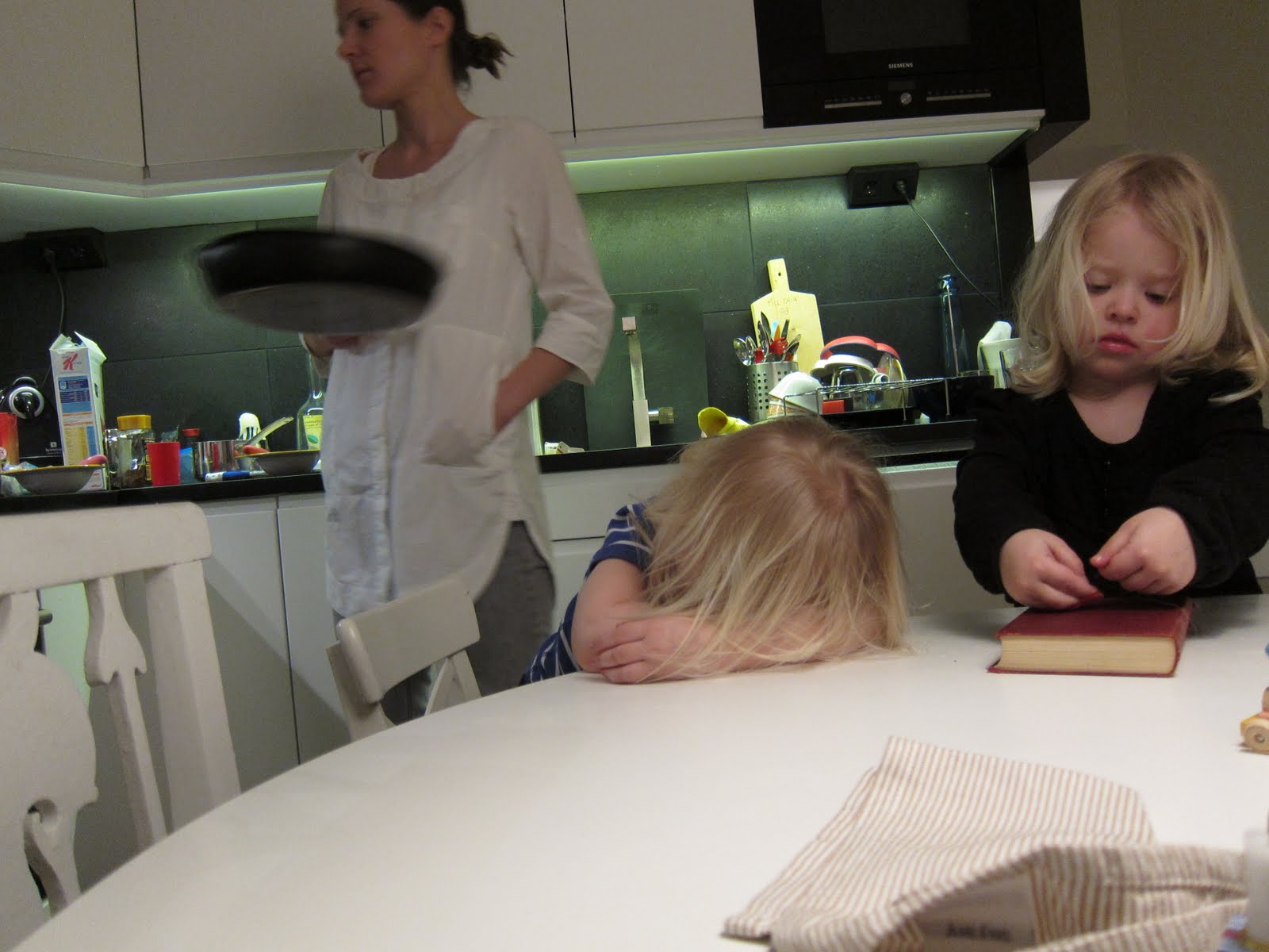 Casual cooking: inte ens för ett gråtande barn och en vidbränd pytt tappar den moderna mamman sin harmoniska attityd. Reinfeldt hade rätt: män är precis lika bra på att göra matlådor till barn som kvinnor.